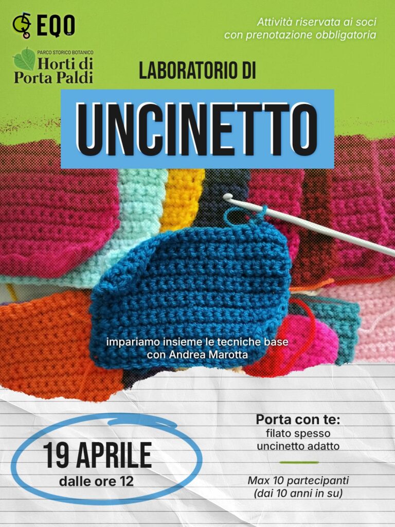 Domenica 19 aprile, dalle ore 12 in poi, agli Horti di Porta Paldi, eqo propone un laboratorio di uncinetto dedicato a chi vuole avvicinarsi alle tecniche base di questa pratica semplice e preziosa. A guidare il laboratorio sarà Andrea Marotta, in un momento pensato per imparare insieme, con calma, curiosità e voglia di stare in relazione.